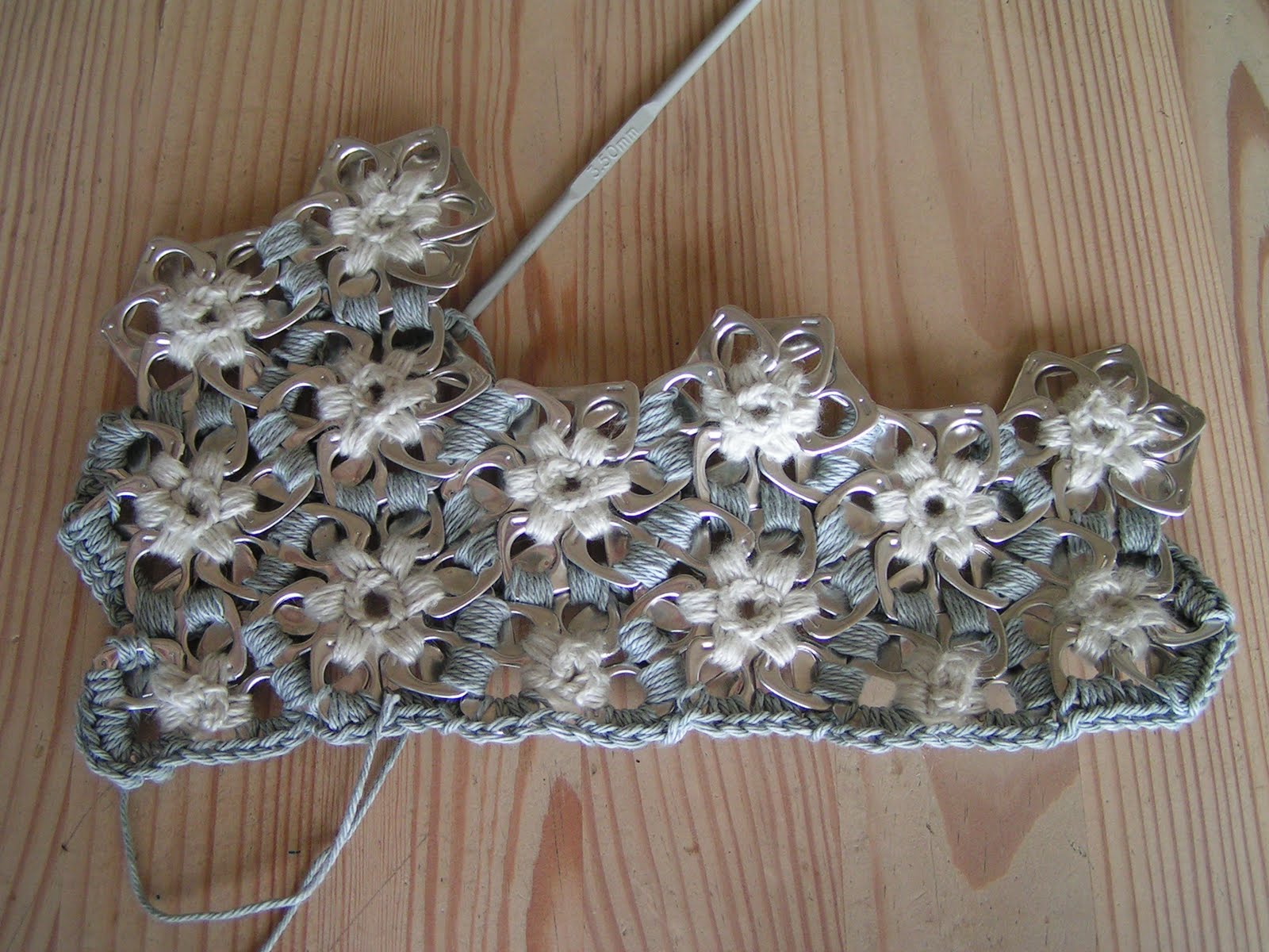Jeg har lige et par spørgsmål. Hvilket garn har du brugt? Er det rigtig forstået, at det eneste man skal bruge er poptabs, garn og hæklenål?